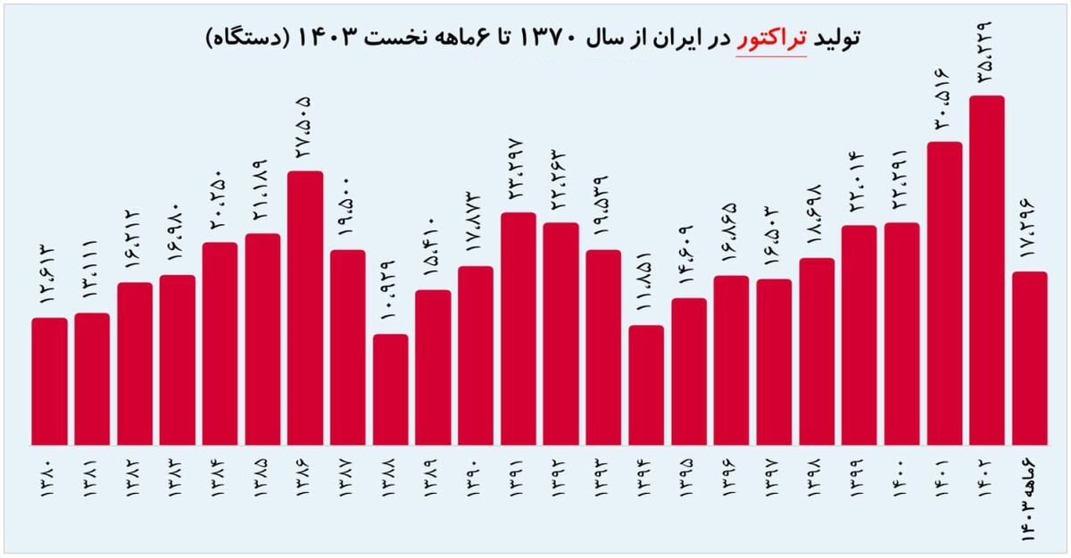 اما موج سوم روند صعودی تولید تراکتور مربوط به چند سال اخیر است که تولید این محصول با ۳۵ هزار و ۲۲۹ دستگاه در سال ۱۴۰۲ رکوردشکنی کرده است. این تعداد در ۶ماهه نخست امسال نیز ۱۷/۳ هزار دستگاه است که نسبت به مدت مشابه سال گذشته رشد ۵/۸ درصدی داشته و میتواند رکورد تولید سال گذشته را بشکند.