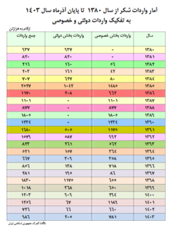 براساس آمارهای گمرک میزان واردات شکر توسط بخش خصوصی از ابتدای سال جاری تا پایان آذرماه ۷۸۱ هزار تن و میزان واردات این محصول توسط بخش دولتی ۲۰۵ هزار تن بوده که نسبت به زمان مشابه سال قبل روند افزایشی داشته است .