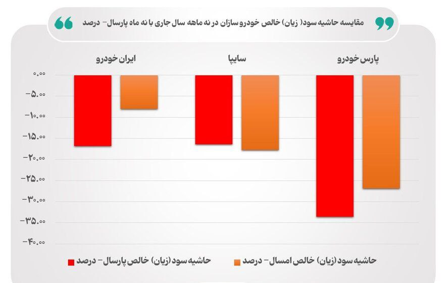 براساس آمارهای منتشر شده در سنا نشان میدهد در ۹ ماهه سال جاری بیشترین حاشیه سود(زیان )خالص امسال مربوط به پارس خودرو بوده است . پارس خودرو در سال گذشته بیشتر از ۳۰درصد زیان داشته که امسال این رقم به نزدیک ۲۵ ردصد رسیده است البته این نکته قابل بازگو است که این شرکت توانسته نسبت به ۹ ماهه سال گذشته زیان خود را کاهش دهد .