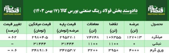 به گزارش اقتصاد نگار، دادوستدهای امروز رینگ صنعتی بورس کالا در سه بخش میلگرد، نبشی و ورق گرم دنبال شد. بدین ترتیب ۷۴.۷ هزار تن انواع میلگرد با متوسط قیمت هر کیلو ۲۹.۸ هزار تومان فروخته شد. بیشترین قیمت برای محموله ۲۵ هزار تنی مجتمع فولاد خراسان با متوسط قیمت ۳۲ هزار و ۹۵۲.۶ تومان به ازای هر کیلو بود که با بیشترین حجم معاملات هم روبه رو بود.