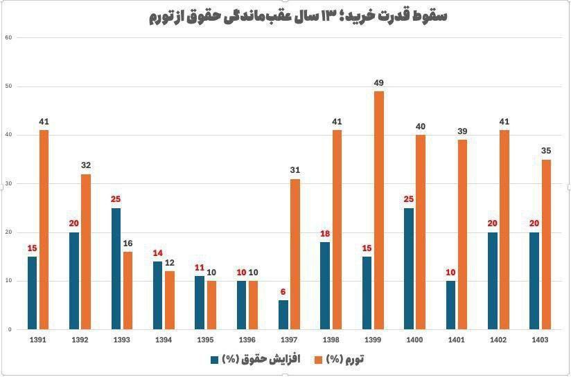 تورم بالای کالاهای اساسی: از آنجایی که قیمتهای کالاهای اساسی مانند مواد غذایی، مسکن، و انرژی بهطور مداوم افزایش یافته، حقوق کارمندان و کارگران نتواستهاند همگام با این افزایش قیمتها رشد کنند و این موجب کاهش شدید قدرت خرید آنان شده است.