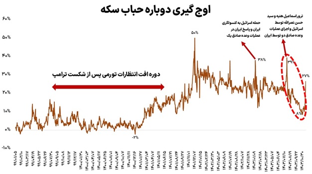 در اوایل سال گذشته پس از عملیات وعده صادق یک که در پی تجاوز اسرائیل به کنسولگری ایران در سوریه بود، نگرانیها از جدیتر شدن تنشها و ایجاد رویارویی سخت باعث هجوم سرمایهها به بازار سکه و بالا رفتن حباب شد. اتفاقی که باعث شد حباب سکه به مرز ۴۰ درصد و سقف یک ساله برسد. ولی با گذر از تنشهای ابتدای سال، حباب سکه رو به کاهش گذاشت و به محدوده ۲۰ درصدی رسید. اما شهادت سید حسن نصرالله در لبنان و ترور اسماعیل هنیه در تهران توسط اسرائیل بار دیگر سطح تنشها را افزایش داد و ایران هم در پاسخ عملیات وعده صادق دو را اجرا کرد. این اتفاقها باعث شد قیمت سکه در اوایل نیمه دوم سال جاری دوباره رشد تند و عجیبی را تجربه کند و حباب سکه هم در همین پی تا مرز ۳۵ درصد رشد کند که از اوایل سال بیسابقه بود.