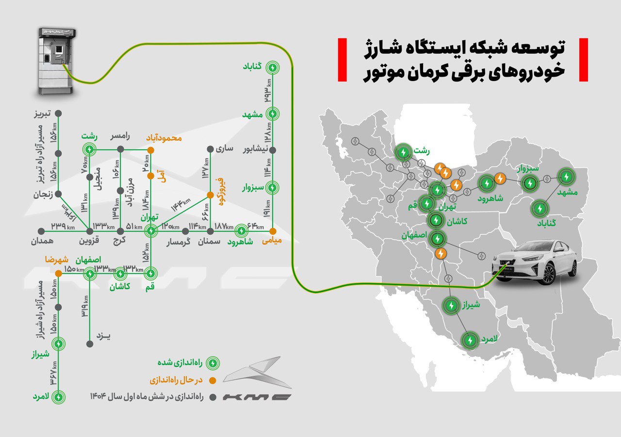 ایستگاههای شارژ خودروهای برقی کرمان موتور از شرق تا شهر مشهد و گناباد در خراسان رضوی، در شهرهای شاهرود و سبزوار واقع در پرترددترین جاده کشور(مسیر تهران-مشهد)، جنوبیترین نقطه استان فارس در شهر لامرد و شهر شیراز و همچنین در شمال کشور تا شهر رشت در استان گیلان توسعه یافته و راه اندازی شده است.