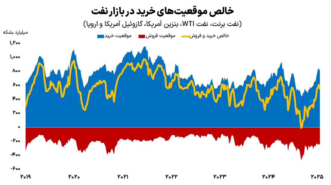 هرچند اوایل سال برخی نگرانیها از آینده عرضه و شوکهای خاورمیانه عدهای را به نفت ۱۰۰ دلاری خوشبین کرده بود، اما در ادامه وضعیت بازار آتی نفت به شدت خرسی (غلبه دیدگاه نزولی) شد. به طوری که پس از سالها یک رکورد منفی عجیب تجربه شد و مجموع موقعیتهای خرید در بازار آتی از موقعیتهای فروش کمتر شد (خالص خرید منفی). اتفاقی که در نمودار زیر (خالص موقعیت های خرید در بازار نفت) قابل مشاهده است و نشاندهنده بدبینی شدید سرمایهگذاران بورسی و مدیران موسسات بینالمللی به آینده قیمتها بود.