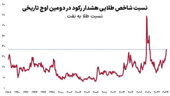 شاخص نسبت طلا به نفت که به طور سنتی دماسنجی از رونق و رکود اقتصادی است به بالاترین سطح خود از زمان کرونا رسیده است. این شاخص میگوید با یک اونس طلا چند بشکه نفت میتوان خرید. اگر قیمتهای بسیار پایین نفت پس از کرونا را که به جهش این شاخص منجر شد کنار بگذاریم، اکنون بالاترین سطح این شاخص در دهههای گذشته محسوب میشود.