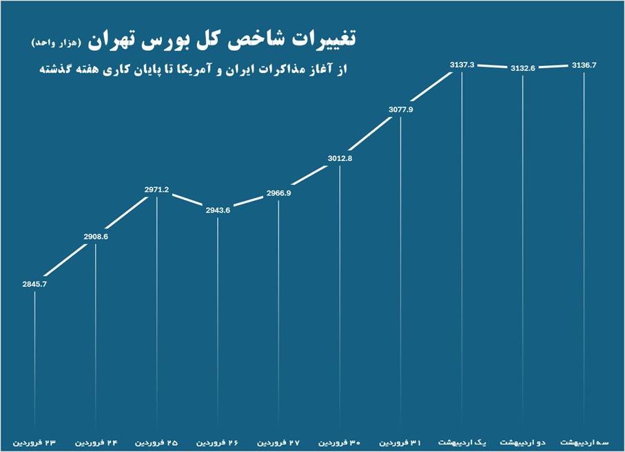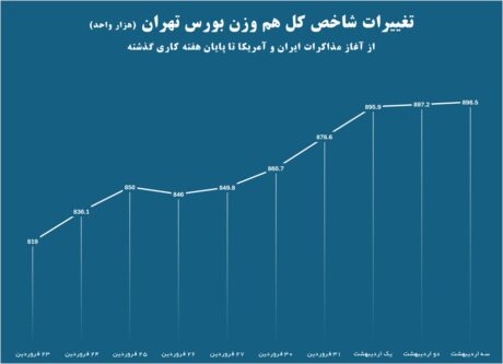 به گزارش اقتصاد نگار، بورس تهران در حالی امروز (۶ اردیبهشت) نخستین روز کاری را آغاز میکند که بررسی معاملات دو هفته گذشته (همزمان با آغاز مذاکرات ایران و آمریکا) نشان میدهد بازار سهام با یک مسیر خیزشی روبه رو شده است. به همین خاطر انتظار میرود روند صعودی آرام معاملات بورس تهران در صورتی که مذاکرات ایران و امریکا در این هفته هم با سیگنال های مثبتی همسو شود، تداوم داشته باشد.