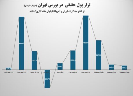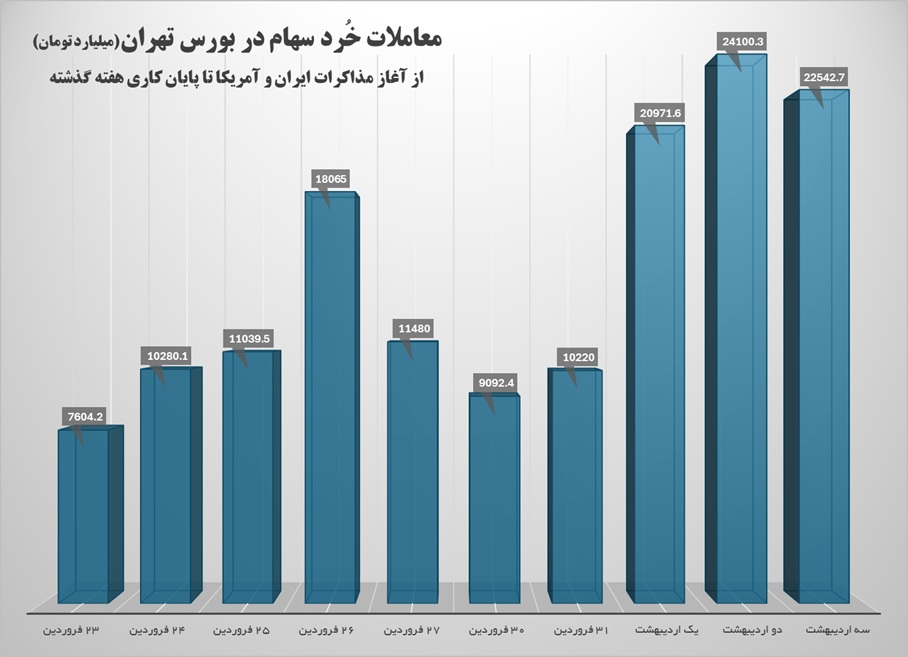بررسی تراز پول حقیقی در سهام به معنای ورودی و خروجیهای پول نشان میدهد تنها روز ۲۶ فروردین در بازار شاهد خروجی پول بودیم و در این دو هفته به صورت متوالی شاهد ورودی پول بودهایم. هر چند که این نسبت در هفته نخست بیشتر است و در هفته دوم این میزان کمتر شده است. نکته بعدی بازار جکایت از افزایش معاملات خرد سهام در هفته دوم نسبت به هفته نخست دارد؛ به طوریکه این نسبت در هفته دوم در سه روز پایانی تقریبا دو برابر شده است.