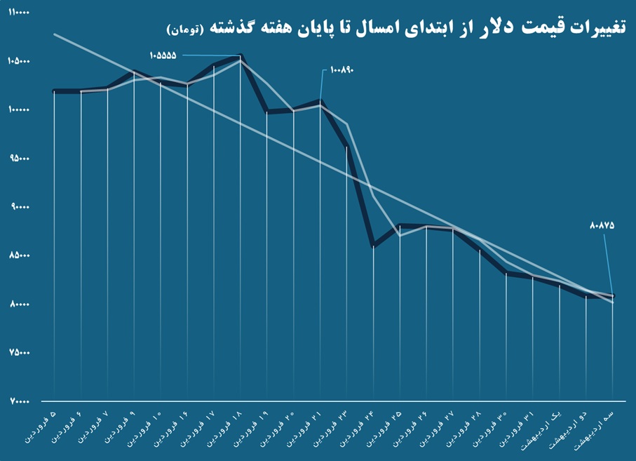 قیمت دلار از ابتدای امسال تا پایان روز چهارشنبه ۳ اردیبهشت (روز پنج شنبه تعطیل رسمی بود) با کاهش ۲۰ درصدی مواجه شده است. این در حالی است که قیمت دلار از زمان زمزمههای رسمی آغاز مذاکرات (۱۸ فروردین) تا پایان روز چهارشنبه ۳ اردیبهشت نیز با افت ۲۳ درصدی مواجه شده است. یعنی تقریبا در دو هفته گذشته و شروع مذاکرات بازار با افت نزدیک ۲۰ درصد مواجه شده است. دلار روز ۱۸ فروردین به قیمت تاریخی ۱۰۵.۵ هم رسید اما اکنون در کانال ۸۰ هزار تومان جاخوش کرده است. البته در معاملات پشت خطی دیشب بازار ارز، قیمت دلار تا کانال ۷۸ هزار تومان هم آمده است.