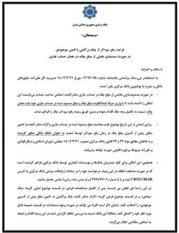 اطلاعیه بانک مرکزی خطاب به شبکه بانکی در جهت فرایند رفع سوءاثر از چک برگشتی با تامین موجودی در صورت مسدودی بخشی از مبلغ چک در همان حساب جاری: