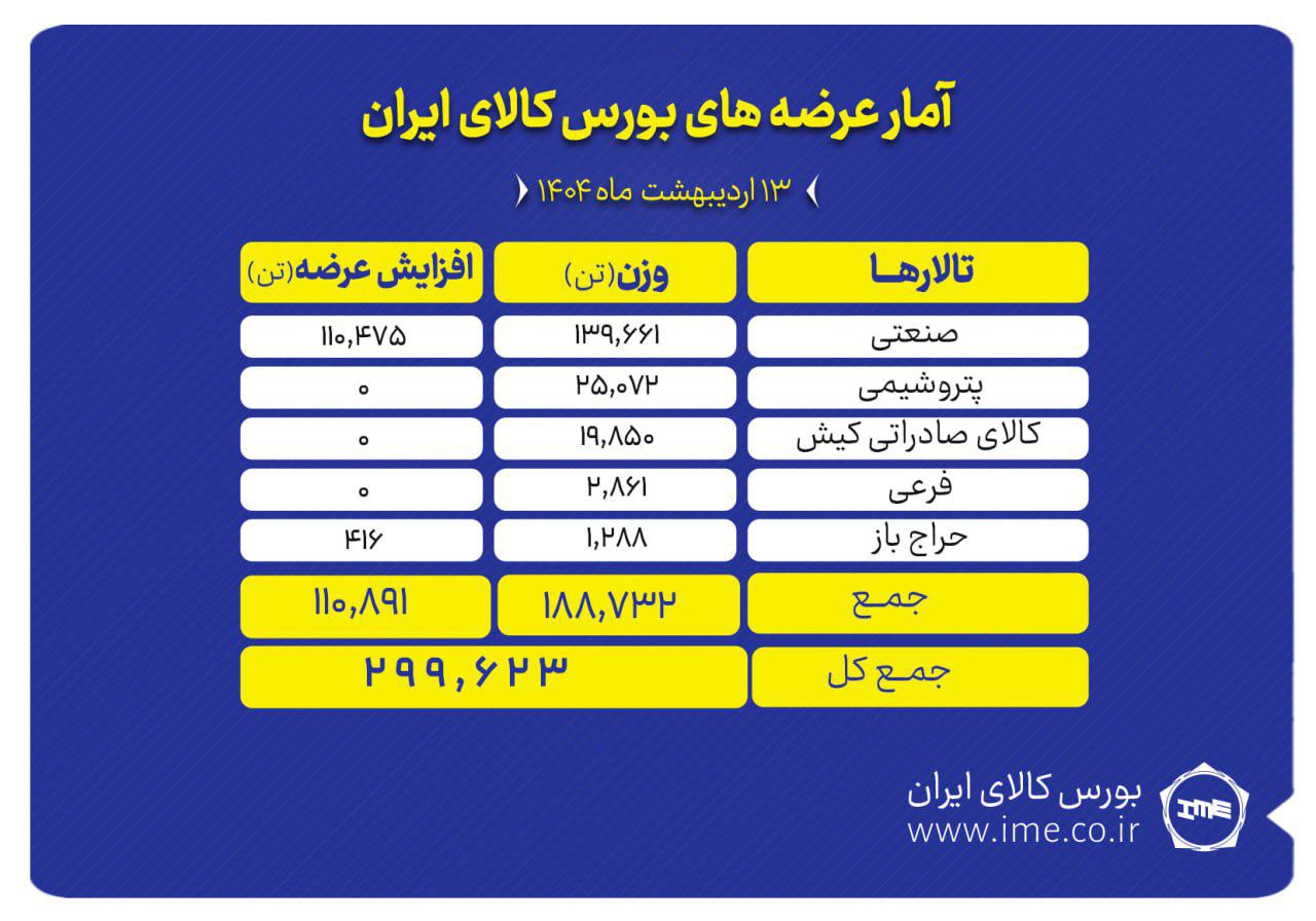 به هر روی بورس کالای ایران، در روز ۱۳ اردیبهشت ۱۴۰۴ با عرضه گسترده خود، بار دیگر جایگاه خود بهعنوان بستری شفاف، رقابتی و کارآمد برای تنظیم بازارهای پایه کشور به نمایش گذاشت. ادامه این روند، منوط به پایدار ماندن تولید داخلی، سیاستگذاری درست ارزی، و حمایت واقعی از صنایع پاییندست خواهد بود.