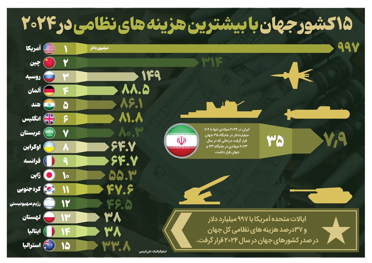 اوکراین با ۶۴.۷ میلیارد دلار و رتبه هشتم، بهواسطه ادامه جنگ با روسیه، هزینههای نظامیاش را به شدت افزایش داده است.رژیم صهیونیستی نیز با ۴۴.۵ میلیارد دلار در جایگاه دوازدهم قرار دارد؛ رقمی که در مقایسه با سالهای گذشته افزایش چشمگیری داشته است.