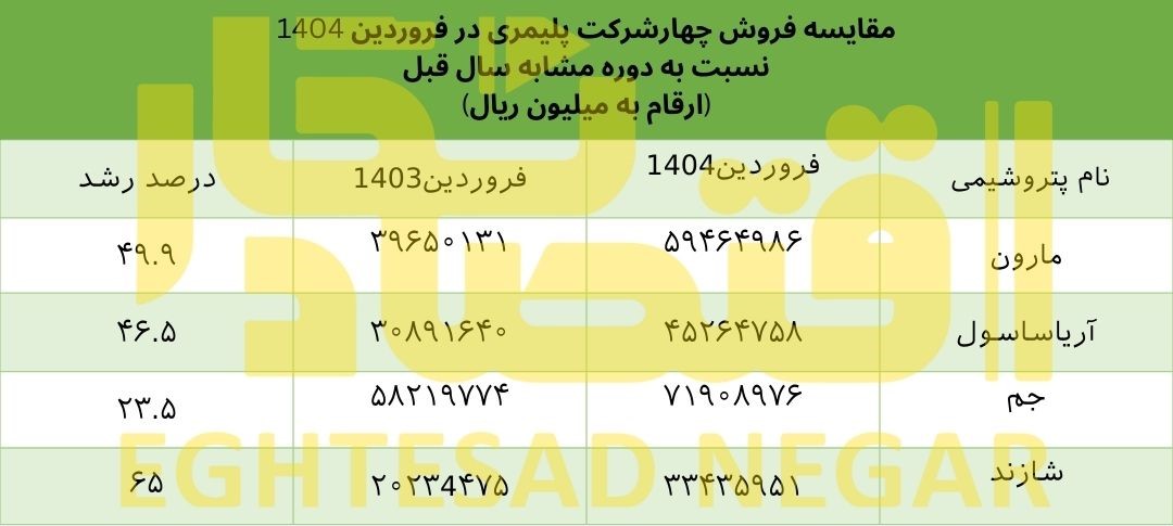 چهار شرکت پلیمری مارون ،آریاساسول ،جم و شازند در فروردین ماه امسال نسبت به دوره مشابه سال قبل با رشدهای چشمگیر فروش همراه بودند.
