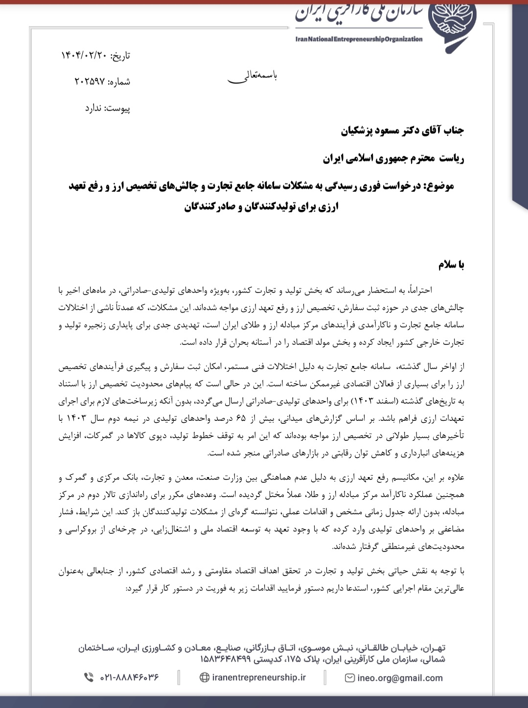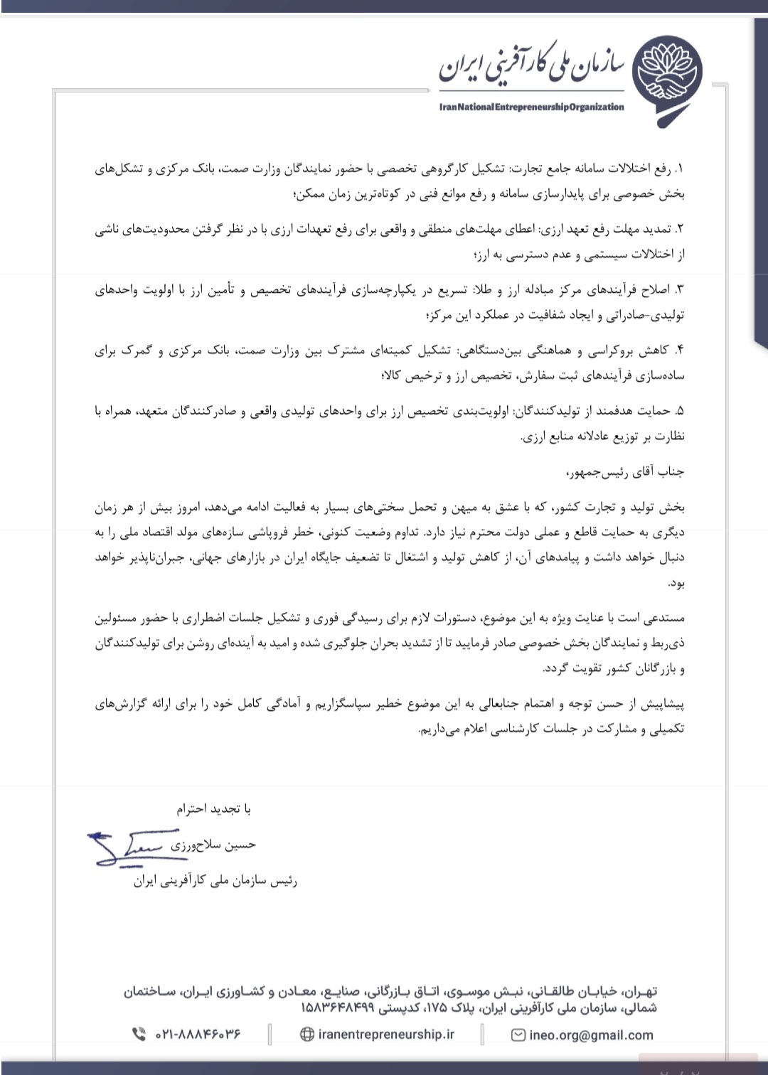 رئیس سازمان ملی کارآفرینی ایران با اشاره به ناهماهنگی میان دستگاهها، ۵ مطالبه کلیدی را مطرح کرد: تشکیل کارگروه اضطراری، اعطای مهلت رفع تعهدات، اصلاح مرکز مبادله ارز، کاهش بروکراسی و حمایت هدفمند از تولیدکنندگان.