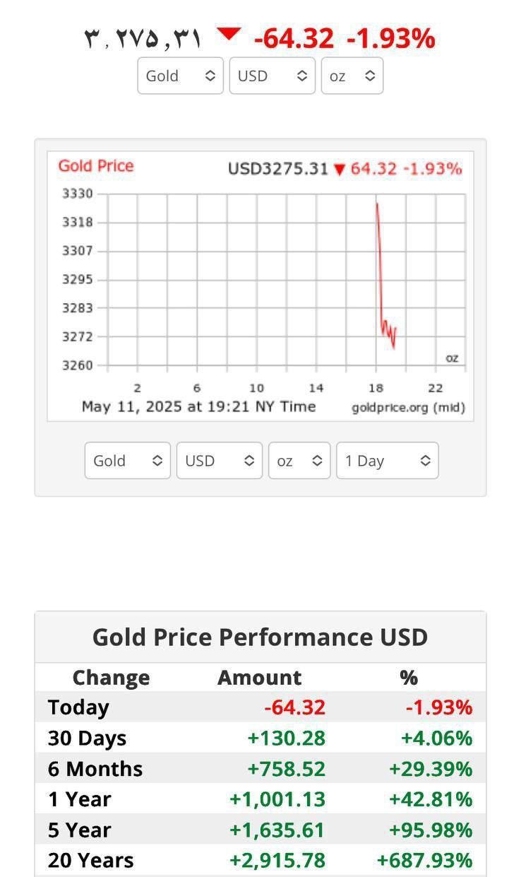به گزارش اقتصادنگار -در معاملات روز ۱۱ مه ۲۰۲۵، قیمت جهانی هر اونس طلا با افتی قابل توجه به ۳۲۷۵ دلار و ۳۱ سنت رسید؛ کاهشی معادل ۶۴.۳۲ دلار یا ۱.۹۳ درصد نسبت به روز قبل. بررسی نمودار روزانه بازار نشان میدهد این سقوط در بازه زمانی کوتاهی رخ داده و واکنش فوری بازار به اخبار ژئوپلیتیکی اخیر بوده است.