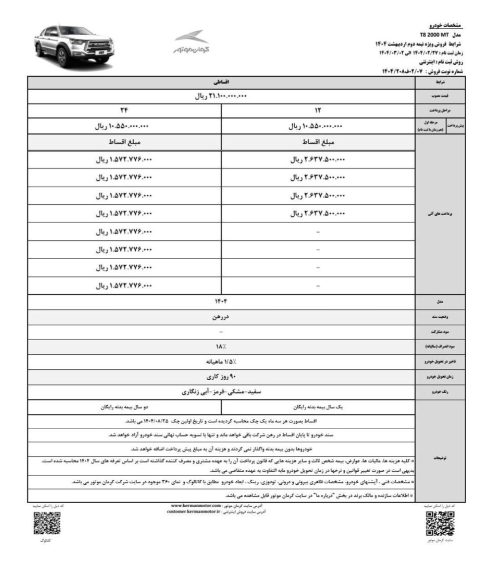 در این بخشنامه، پیکاپ KMC T۸ مدل ۱۴۰۴ با قیمت قطعی ۲ میلیارد و ۱۱۰ میلیون تومان عرضه میشود. متقاضیان میتوانند با پیشپرداخت ۱ میلیارد و ۵۵ میلیون تومان در یکی از دو بازه زمانی اقساطی ۱۲ یا ۲۴ ماهه اقدام به خرید این خودرو کنند. اقساط بهصورت سهماهه محاسبه شده و در روش ۱۲ ماهه، مبلغ هر قسط ۲۶۷ میلیون تومان و در روش ۲۴ ماهه، مبلغ هر قسط ۱۵۷ میلیون تومان خواهد بود.