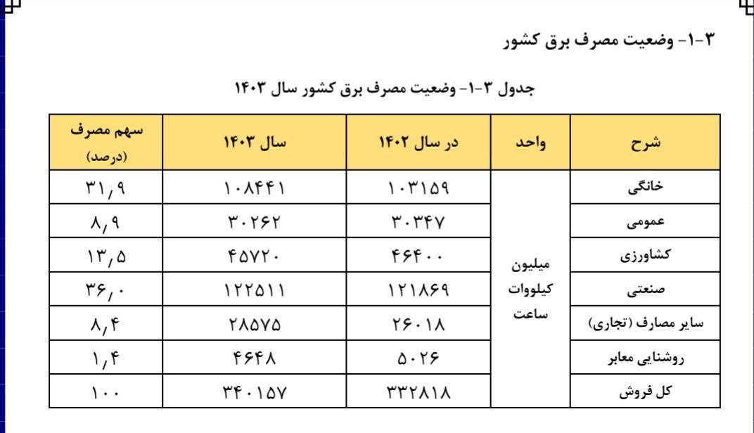 مجموع مصرف برق کشور در سال ۱۴۰۳ بالغ بر ۳۴۱ هزار و ۵۷۰ میلیون کیلوواتساعت بوده که نسبت به سال گذشته رشدی معادل ۳.۴ درصد را ثبت کرده است. هرچند این رشد بهظاهر محدود، بهواسطه تنشهای زیستمحیطی، چالشهای زیرساختی و تغییرات اقلیمی، اهمیتی فراتر از ظاهر خود دارد.