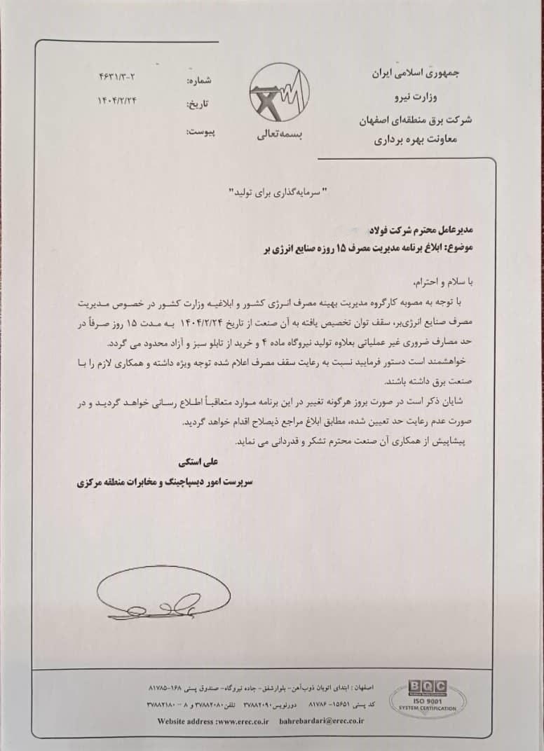 نمونه ای از نامه ای فولاد سازان که از شرکت برق منطقه ای برای توقف تولید دریافت کردند.
