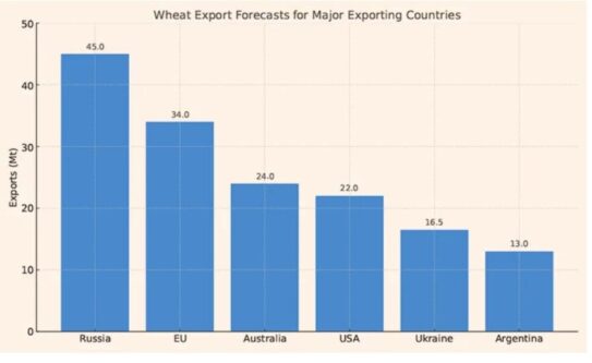 در سمت عرضه، چرخشهای چشمگیری در نقشه صادرات جهانی دیده میشود. اتحادیه اروپا قرار است بزرگترین رشد صادرات را در میان صادرکنندگان عمده تجربه کند و با افزایش ۷.۵ میلیون تنی، صادرات خود را به ۳۴ میلیون تن برساند. با این وجود، روسیه همچنان عنوان بزرگترین صادرکننده گندم جهان را حفظ میکند و پیشبینی میشود صادرات خود را به ۴۵ میلیون تن برساند.