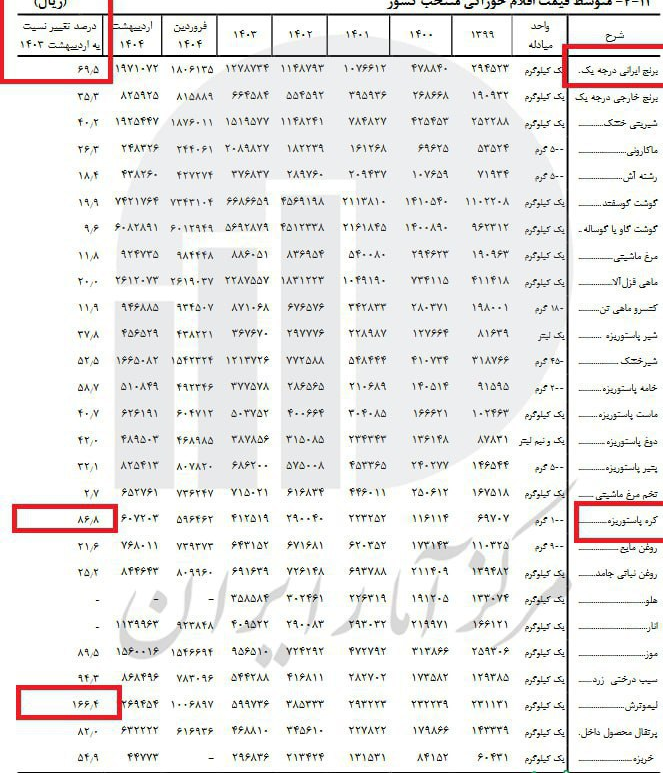 به گزارش اقتصادنگار- گزارش تازه مرکز آمار ایران از متوسط قیمت اقلام خوراکی منتخب در کشور نشان میدهد که در اردیبهشت ۱۴۰۴، بهای بسیاری از کالاهای اساسی نسبت به مدت مشابه سال گذشته افزایش قابل توجهی داشته است. در صدر این لیست، برنج ایرانی درجه یک و گوشت گوسفندی با رشدهای چشمگیر قرار دارند که نشان از فشار فزاینده تورم بر معیشت خانوار دارد.
