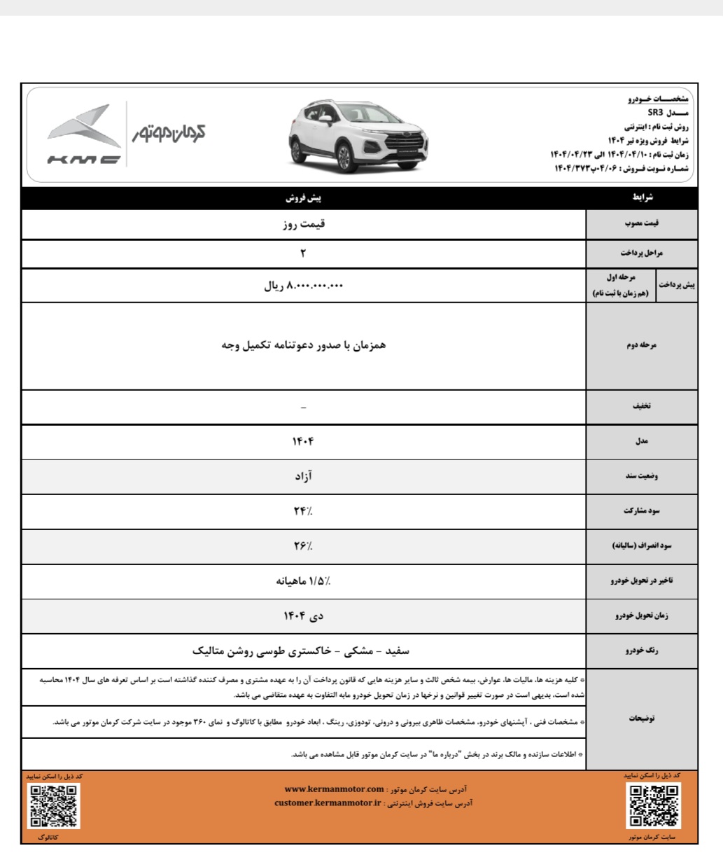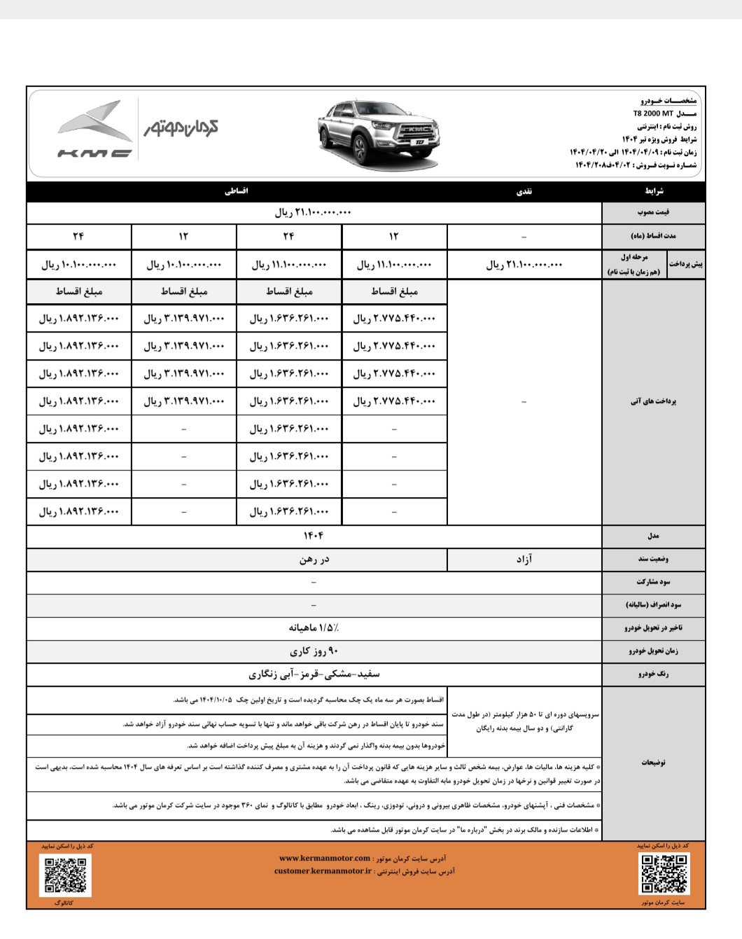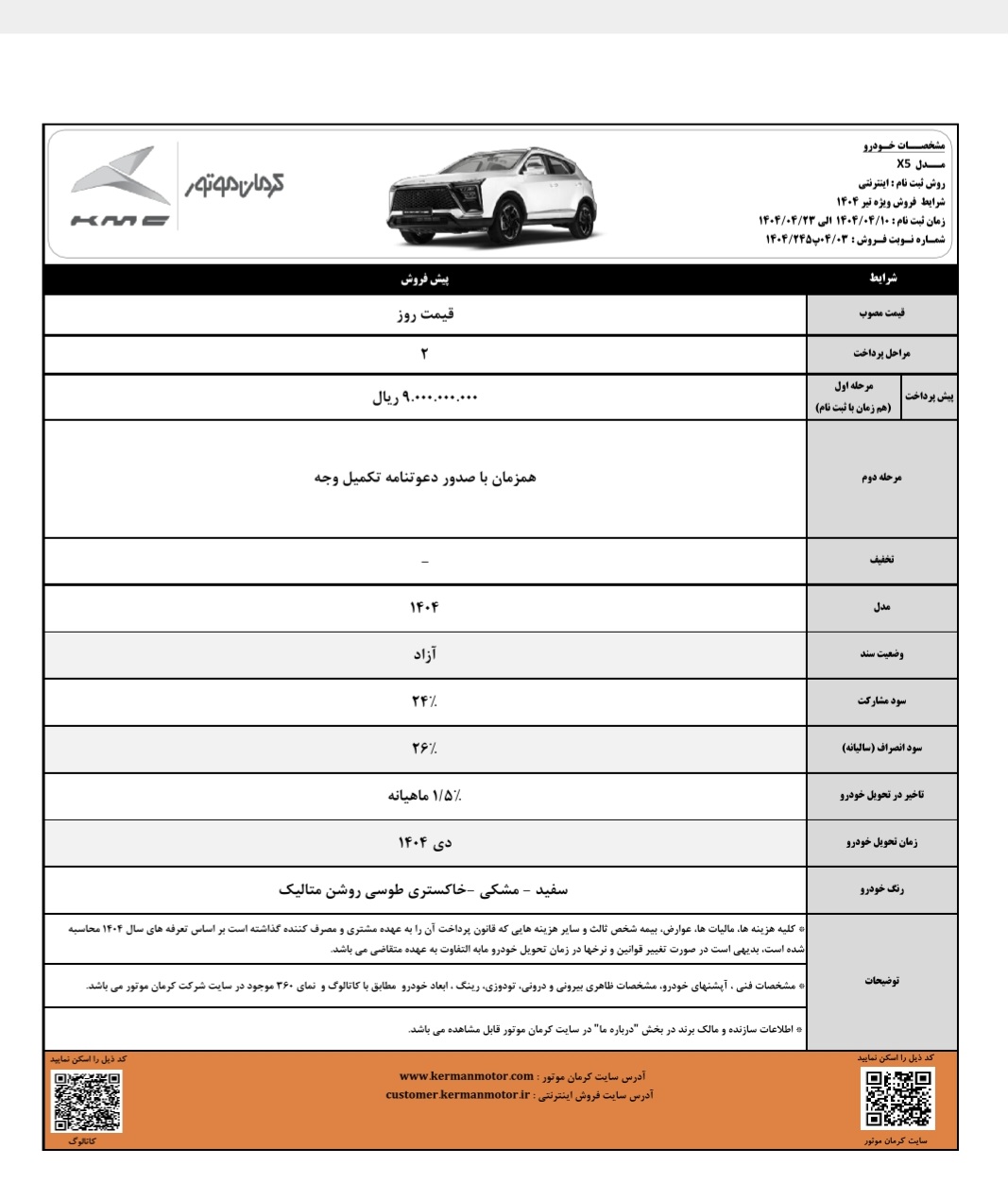 به گزارش اقتصادنگار، خودروسازی کرمان موتور از طرح فروش ۵ محصول KMC خبر داد. طبق این اطلاعیه متقاضیان خرید پنج محصول KMC T9، KMC SR3، KMC X5 و KMC J7 میتوانند از روز سهشنبه دهم تیرماه ۱۴۰۴ تا دوشنبه ۲۳ تیر نسبت به ثبتنام اینترنتی در وبسایت رسمی کرمان موتور به آدرس customer.kermanmotor.ir اقدام کنند. شرایط این طرح به شرح زیر است: