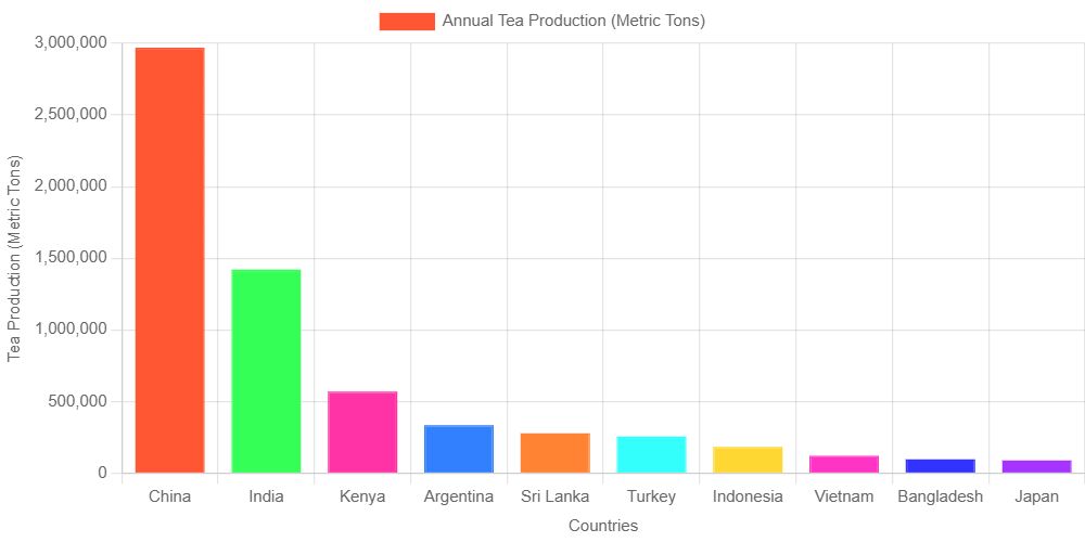 بر اساس دادههای سازمان خواربار و کشاورزی ملل متحد (فائو)، تولید جهانی چای در سال ۲۰۲۴ به ۶.۷ میلیون تن رسیده است؛ رقمی که نسبت به سطح ۶.۳ میلیون تنی سال ۲۰۲۰ رشد اندکی را نشان میدهد. چین و هند همچنان پرچمداران بیرقیب تولید هستند و به تنهایی بیش از ۶۹ درصد از تولید جهانی را در اختیار دارند؛ چین با ۲.۹۷ میلیون تن و هند با ۱.۴۲ میلیون تن، به ترتیب در رتبههای اول و دوم ایستادهاند. پس از این دو، کنیا با تولید ۵۷۰ هزار تن، جایگاه سوم را به خود اختصاص داده است.