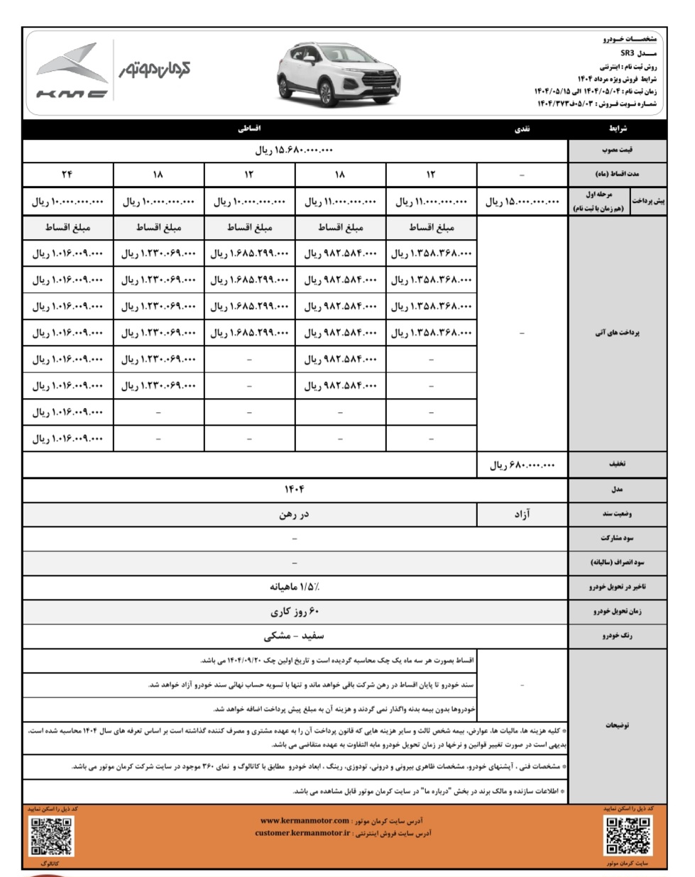 کرمان موتور در جدیدترین طرح فروش خود (ویژه مرداد ماه 1404)، شرایط فروش نقدی و اقساطی خودروی جدید KMC SR3 را آغاز کرد.
