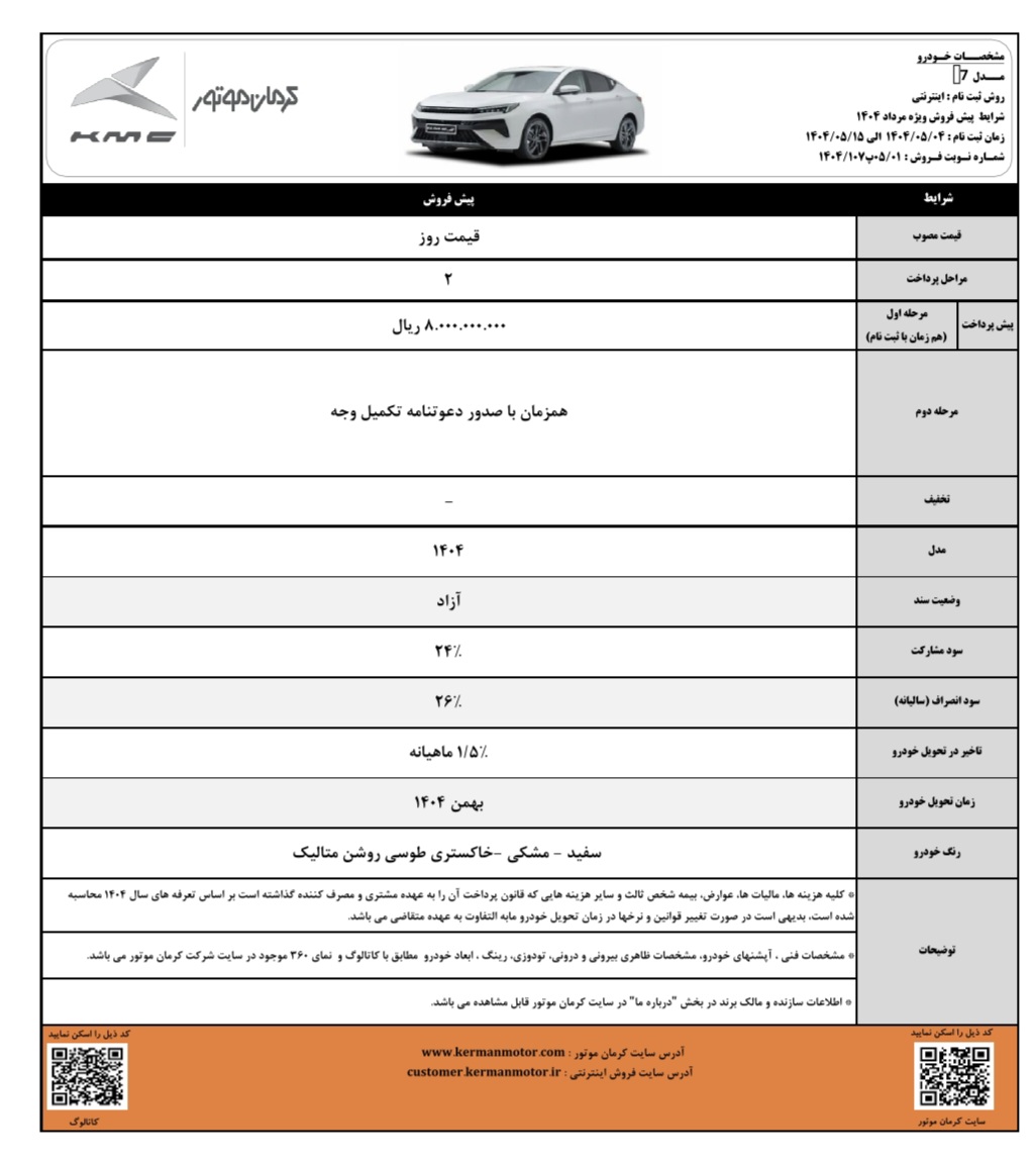 سدان محبوب کرمان موتور در شرایط پیش فروش نیمه اول مرداد ۱۴۰۴ با مبلغ پیش پرداخت ۸۰۰ میلیون به فروش میرسد. موعد تحویل خودرو بهمن ۱۴۰۴ اعلام شده و سود مشارکت سالیانه ۲۴ درصد است.
