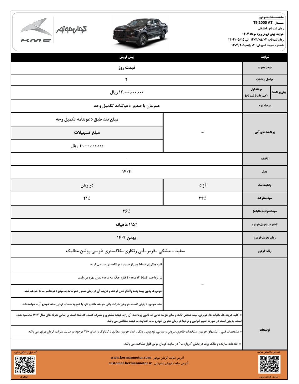 شرایط پیشفروش KMC T9 با مبلغ پیشپرداخت یک میلیارد و ۲۰۰ میلیون تومان با موعد تحویل بهمن ۱۴۰۴ اعلام شده است. سود مشارکت سالیانه برای متقاضیان ۲۴ درصد و همچنین امکان استفاده از تسهیلات تا یک میلیارد تومان با بازپرداخت ۱۲ ماهه در دسترس خواهد بود.