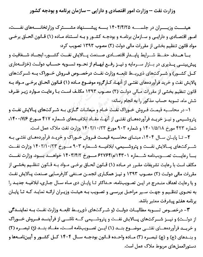 هیات وزیران با هدف ایجاد شفافیت در بازار سرمایه و ساماندهی روابط مالی میان دولت و شرکتهای پالایشی، دستورالعمل جدیدی را به تصویب رساند که به موجب آن، نحوه تسویهحساب فروش خوراک و خرید فرآوردههای نفتی تا پایان دیماه سال جاری تعیین تکلیف میشود.