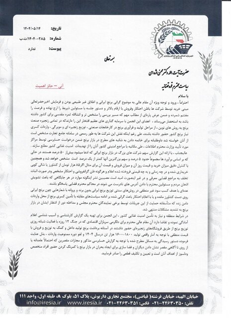احتراماً ، ورود و توجه ویژه آن مقام عالی به موضوع گرانی برنج ایرانی و اطلاق غیر طبیعی بودن و فرمایش اخیرحضرتعالی مبنی بر خرید توسط شرکتها باظن احتکار و فروش با ارقام بالاتر و دستور جلسه با مسئولین ذیربط را ارج نهاده و فرصت را مغتنم شمرده و ضمن عرض پارهای از مطالب مهم که مسیر بررسی را مشخص تر و انشاالله ثمره مقدسی برای کشور داشته باشد به استحضار میرساند ، اعضای این انجمن با سرمایهگذاری های عظیم افتخار این را دارند که در تمامی زنجیره صنعت برنج به روش های نوین ، از مراحل تولید و فرآوری برنج در کارخانجات صنعتی ، توزیع زنجیرهای و مویرگی، واردات کسری نیاز برنج کشور حضور داشته باشند، علی رغم اینکه نقش این شرکت ها به طور رسمی در سامانه جامع تجارت مشخص است از آنان خواسته شد داوطلبانه برای خاتمه دادن به شائبه های مطرح در بازار برنج ضمن درخواست حسابرسی توسط مراکز مورد تأیید وزارت محترم اطلاعات ، طی مکاتبه با مراجع امنیتی کشور آنان را از تهدیدات امنیت غذایی کشور مطلع سازند.
