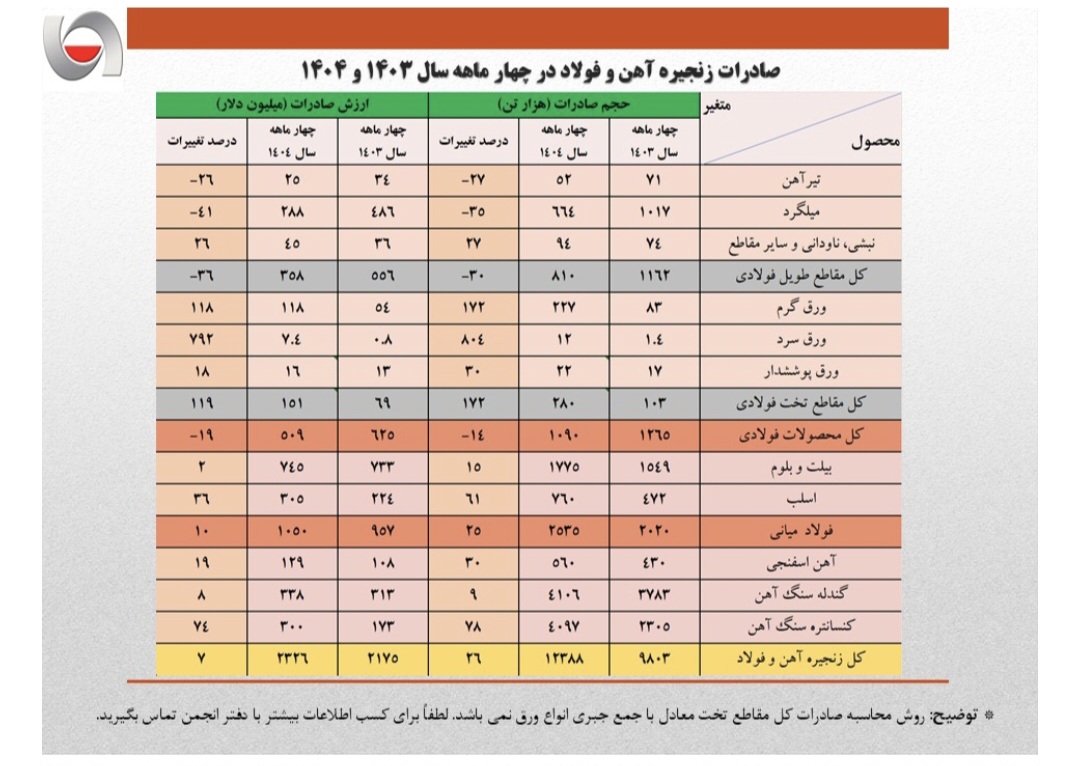 حجم صادرات بیلت و بلوم که در آمار ۳ ماهه افت ۸ درصدی داشت، در آمار ۴ ماهه تغییر روند داده و ۱۵ درصد رشد را به ثبت رسانده است.