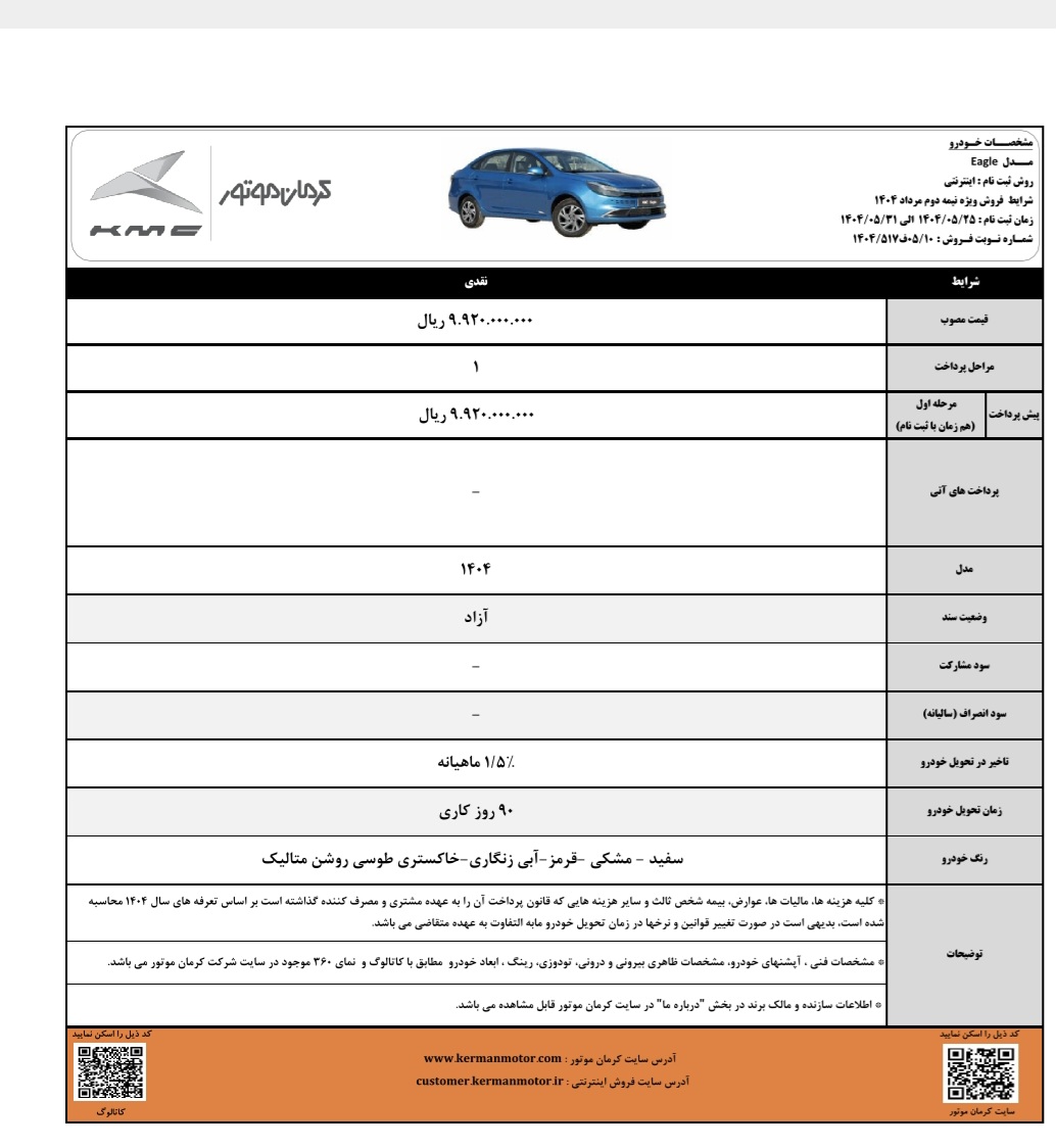 به گزارش اقتصادنگار، در این طرح، خودروی KMC ایگل با قیمت مصوب ۹۹۲ میلیون تومان به صورت نقدی و با موعد تحویل ۹۰ روز کاری عرضه میشود.