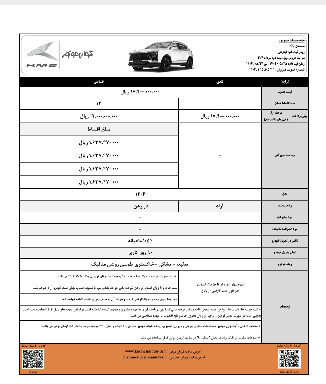 کراس اوور KMC X5 نیز قیمت مصوب یک میلیارد و ۷۴۰ میلیون تومان در نظر گرفته شده است. این خودرو به صورت نقدی با سرویسهای رایگان دورهای تا ۵۰ هزار کیلومتر (در مدت گارانتی) عرضه میشود. در شرایط اقساطی، مبلغ پیش پرداخت یک میلیارد و ۲۰۰ میلیون تومان تعیین شده و مابقی مبلغ طی اقساط ۱۲ ماهه پرداخت خواهد شد. موعد تحویل در این طرح نیز ۹۰ روز کاری اعلام شده است. تاریخ اولین چک اقساط ۲۰ بهمن ۱۴۰۴ اعلام شده است.