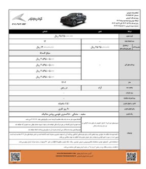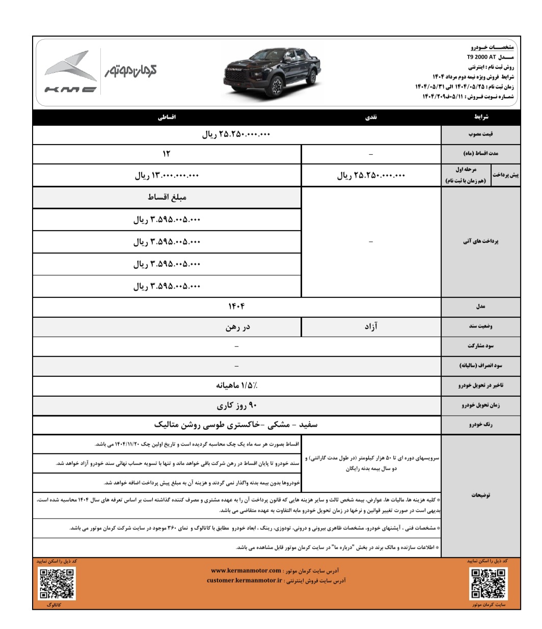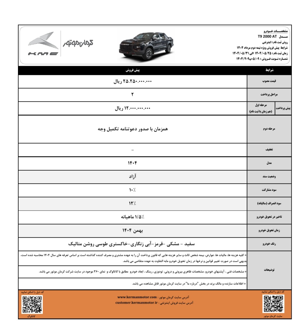 پیکاپ KMC T9 نیز با قیمت مصوب دو میلیارد و ۵۲۵ میلیون تومان، هم به صورت نقدی و هم اقساطی عرضه خواهد شد. خریداران نقدی از مزایای ویژه شامل سرویسهای دورهای رایگان تا ۵۰ هزار کیلومتر در مدت گارانتی و دو بیمه بدنه رایگان بهرهمند میشوند. در شرایط اقساطی این خودرو، مبلغ پیشپرداخت یک میلیارد و ۳۰۰ میلیون تومان تعیین شده و بازپرداخت در اقساط ۱۲ ماهه انجام میشود. تاریخ اولین چک ۲۰ بهمن ماه تعیین شده و موعد تحویل خودرو ۹۰ روز کاری خواهد بود. همچنین کرمان موتور این خودرو دو دیفرانسیل را در قالب طرح پیش فروش با قیمت قطعی نیز عرضه میکند که شامل پرداخت مرحله اول به مبلغ یک میلیارد و ۲۰۰ میلیون تومان با موعد تحویل در بهمن ۱۴۰۴ است.