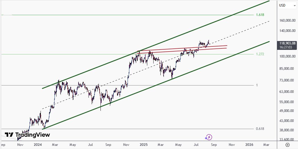 «روند صعودی از محدوده ۱۵ هزار دلار آغاز شد و اکنون حدود ۹۰ درصد مسیر خود را طی کردهایم. نمودارها نشان میدهد سقف کانال میانمدت در محدوده ۱۵۰ تا ۱۷۰ هزار دلار قرار دارد و همزمانی این سطح با فیبوی ۱.۶۱۸ باعث شده این ناحیه از اعتبار بالایی برخوردار باشد. بنابراین پاییز ۱۴۰۴ میتواند زمان تکمیل این سیکل صعودی باشد.»