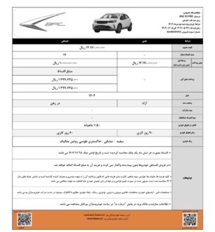 در شرایط اقساطی ۱۲ ماهه متقاضیان میتوانند با مبلغ یک میلیارد تومان پیش پرداخت خودرو را خریداری کنند. اقساط این شرایط فروش به صورت هر شش ماه یک چک محاسبه شده و مبلغ هر چک ۱۴۹ میلیون تومان است که تاریخ اولین چک ۲۵ بهمن ۱۴۰۴ اعلام شده است.