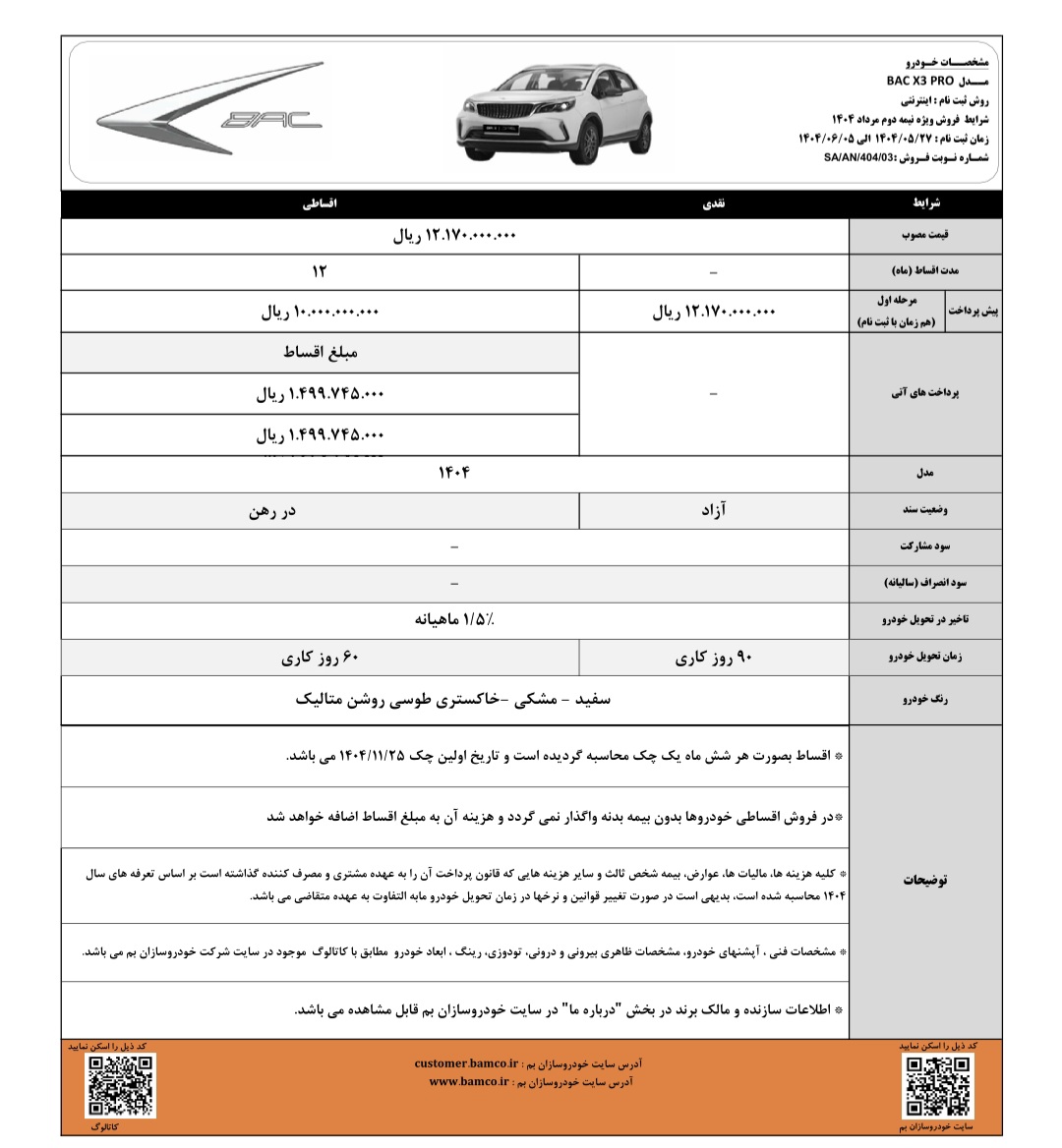 متقاضیان میتوانند برای کسب اطلاعات بیشتر درباره خودروی BAC X3 Pro به سایت www.bamco.ir مراجعه کنند. تا ساعت ۶ عصر روز چهارشنبه پنجم شهریور ۱۴۰۴ فرصت دارید برای خرید این خودرو از طریق صفحه فروش خودروسازان بم به نشانی customer.bamco.ir اقدام کنید.