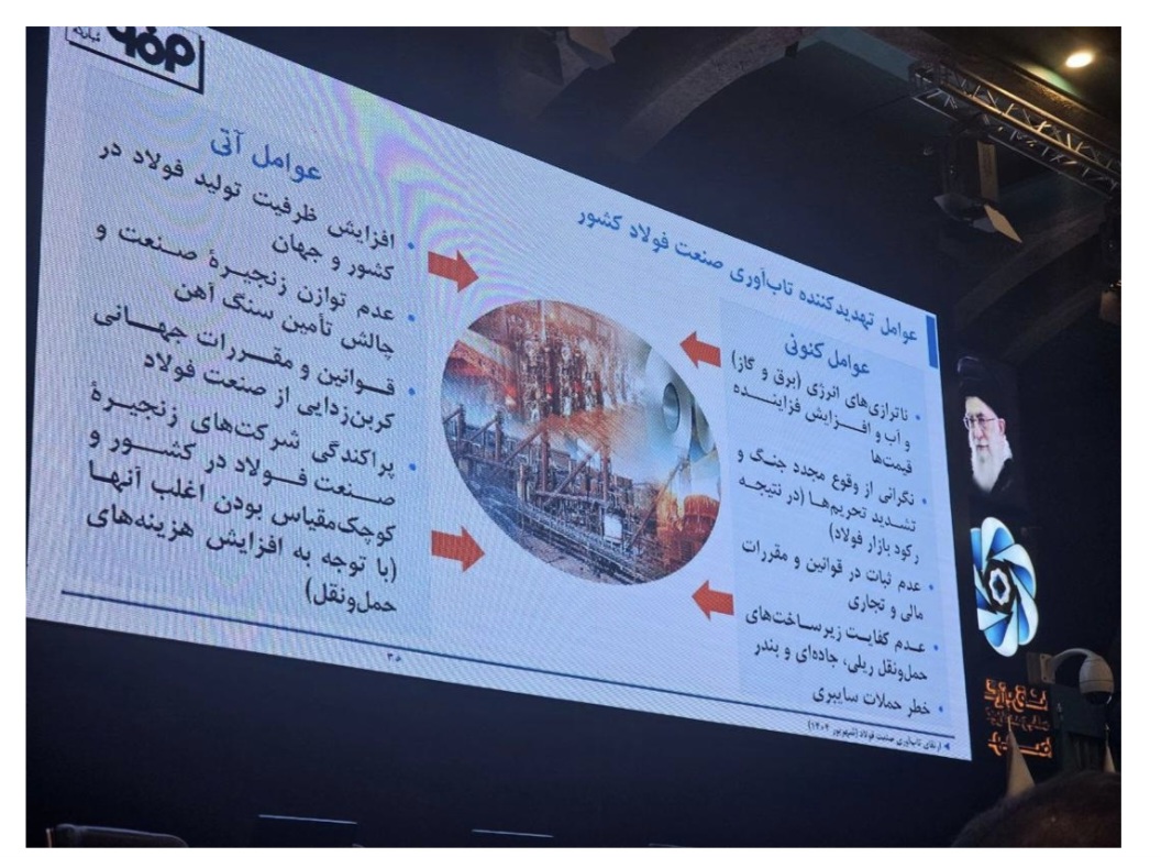 معاون برنامهریزی شرکت مهندسی فولاد تکنیک، نیزدر همایش تابآوری در زنجیره آهن و فولاد کشور با ارایه گزارشی از وضعیت صنعت فولاد گفت: حدود ۴ درصد GDP کشور به فولاد اختصاص دارد، اما ۴۲ درصد ظرفیت تولید این صنعت خالی است و در صورت تداوم شرایط، این رقم میتواند به ۵۰ درصد برسد.
