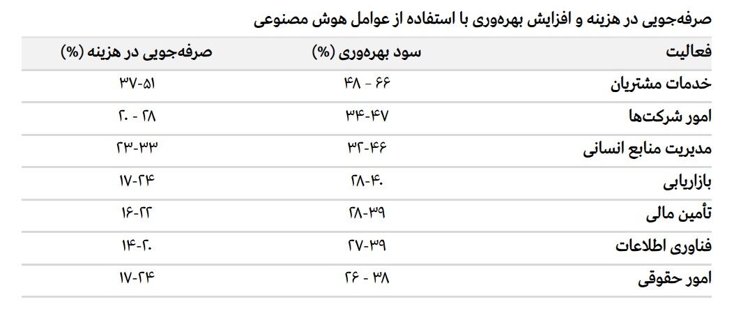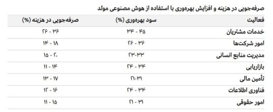 هوش مصنوعی به ویژه در وظایف تکراری، فشرده یا مبتنی بر داده، بهرهوری و صرفهجویی را به سطح بالایی میرساند. در این میان، خدمات مشتری با افزایش بهرهوری ۴۵ درصد و کاهش هزینه ۳۶ درصد، بیشترین سود را از AI میبرد. امور شرکتها و منابع انسانی نیز با بهرهوری بالای ۳۰ درصد و صرفهجویی تا ۲۰ درصد، از مزایای خودکارسازی بهرهمند میشوند. حتی حوزههای حقوقی نیز با بهرهوری ۳۱–۲۱ درصد نشان میدهند که هوش مصنوعی میتواند وارد فرآیندهای حساس شود.