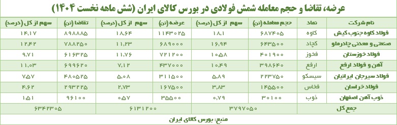 آمار شش ماهه عرضه، تقاضا و حجم معامله شمش فولادی (بلوم و بیلت فولادی) برگرفته از آمار رسمی بورس کالای ایران است. جدول زیر برتری فولاد کاوه جنوب کیش در عرضه، تقاضا و حجم معاملات شمش فولادی در بورس کالا در کشورمان در شش ماه نخست سال ۱۴۰۴ را نشان میدهد.