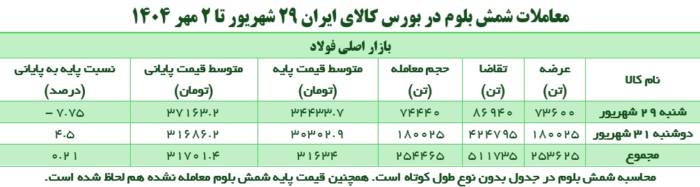 متوسط قیمت هر کیلو شمش بلوم فروخته شده در هفته سپری شده ۳۱.۷ هزار تومان بود که با رقابت ۰.۲ درصد همراه بود. این در حالی بود که روند قیمتها نسبت به مدت مشابه هفته گذشته (۲۲ تا ۲۶ شهریور) با ۳.۳۵ درصد رشد روبه رو شده بود. نسبت تقاضا به عرضه همچنان بیش از دو برابر بود.
