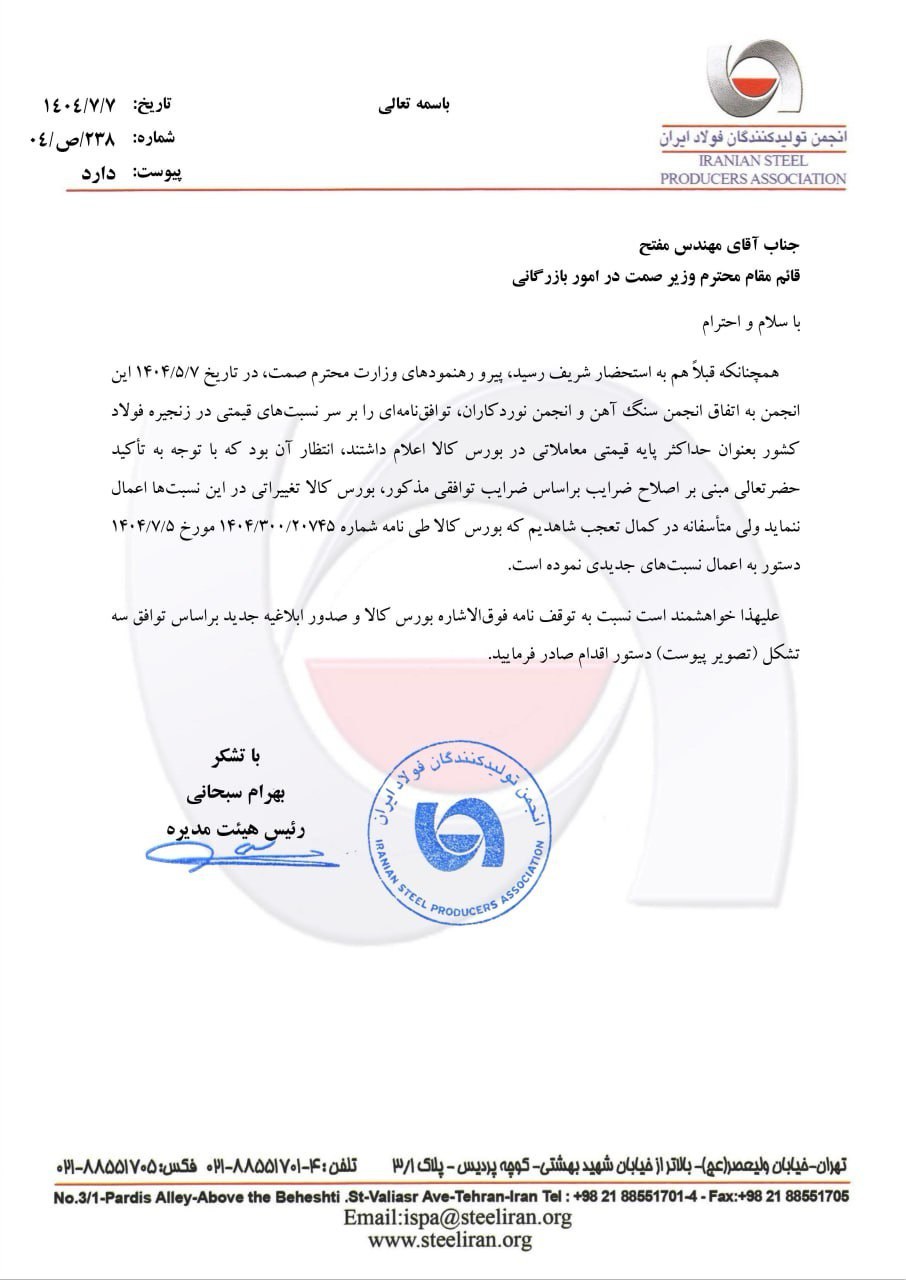 به گزارش اقتصادنگار، بهرام سبحانی رئیس انجمن فولاد در این نامه با اشاره به توافق تاریخی تشکلهای زنجیره فولاد بر ضرایب قیمتی محصولات این زنجیره به عنوان حداکثر قیمت پایه عرضه در بورس کالا، از قائم مقام وزیر صمت خواسته با ورود به موضوع، وعده خود مبنی بر اجرای توافق تشکلها را عملیاتی کند.