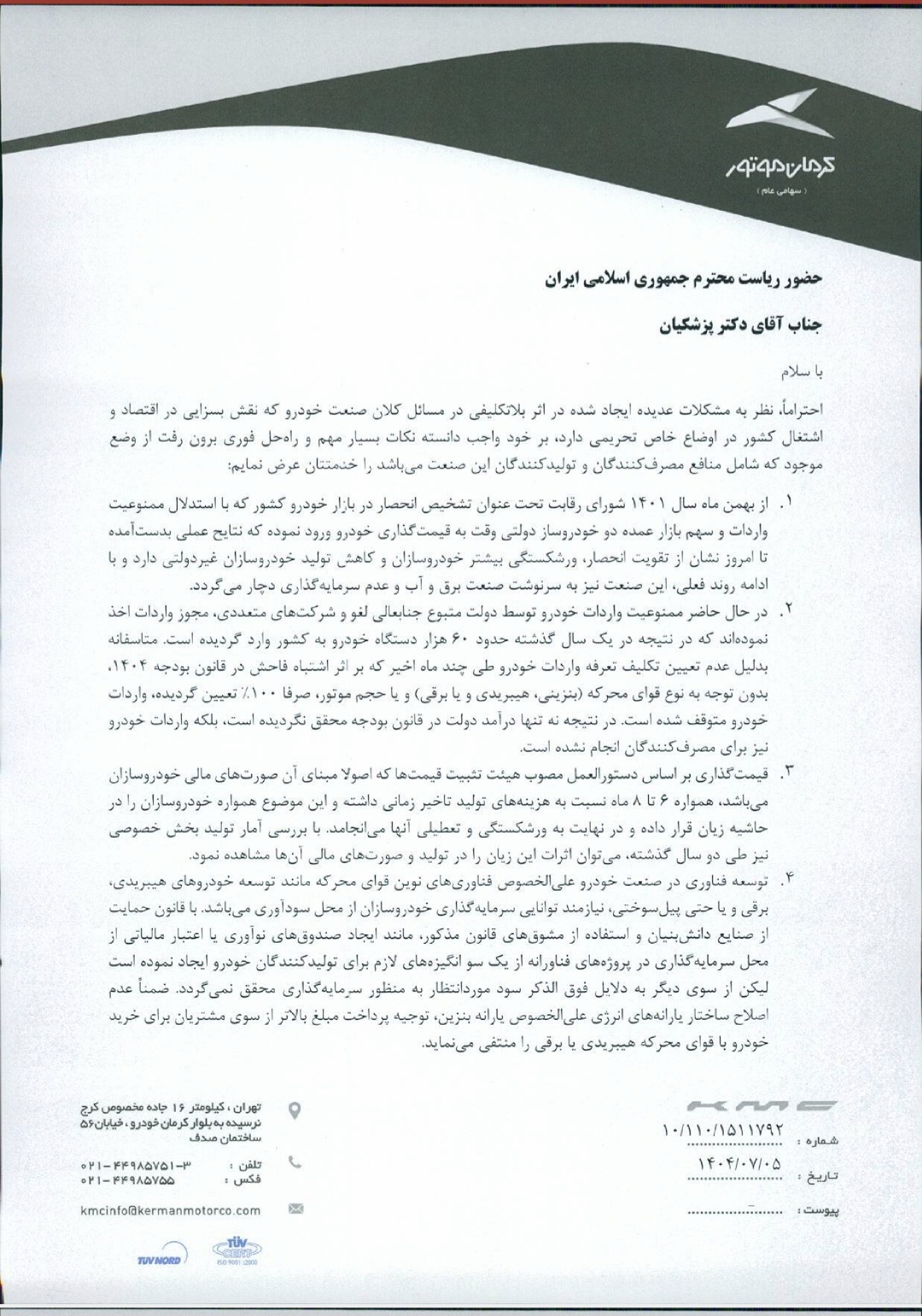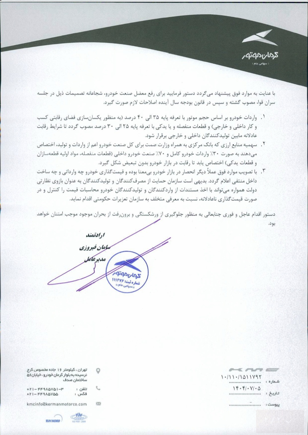 به گزارش اقتصادنگار، متن کامل نامه مدیرعامل شرکت کرمان موتور به رئیس جمهور به این شرح است: