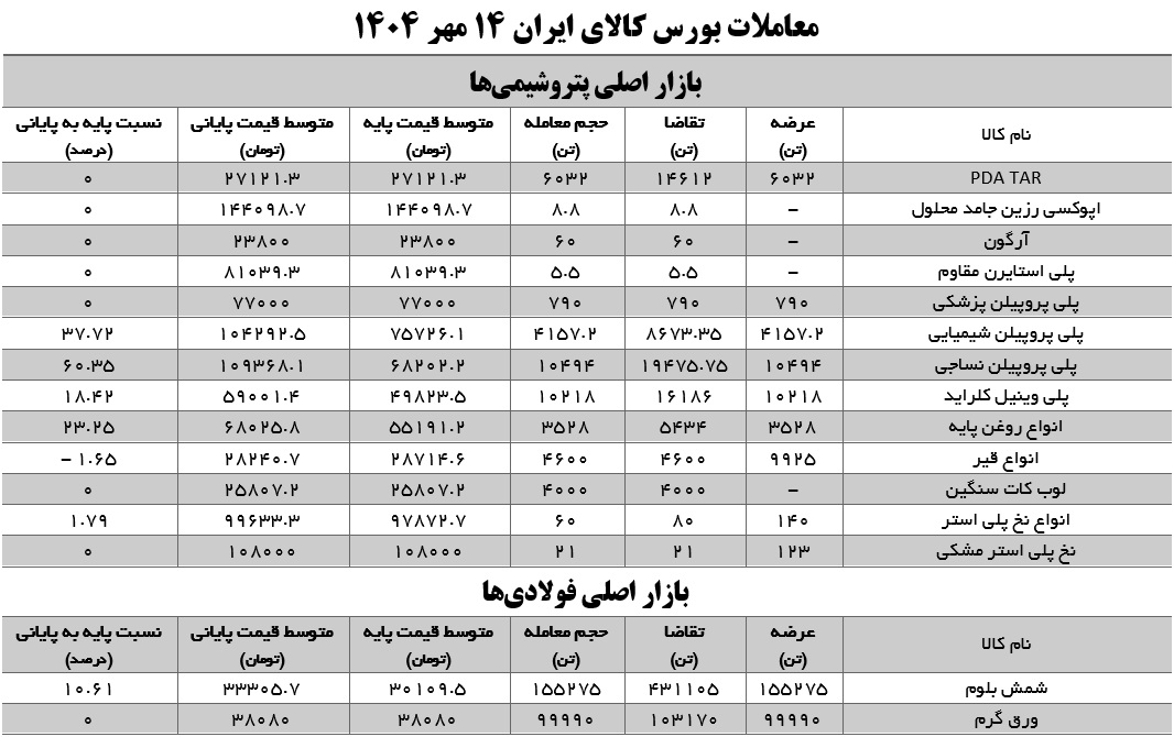 در دادوستدهای روز دوشنبه (۱۴ مهر) فولاد کاوه جنوب کیش؛ ۴۵ هزار تن، فولاد خوزستان؛ ۳۰ هزار تن، صنعتی و معدنی چادرملو؛ ۲۵ هزار تن، فولاد خراسان؛ ۱۰ هزار تن و صنایع فولاد آلیاژی پاسارگاد؛ ۱۰ هزار تن شمش بلوم فروخت.