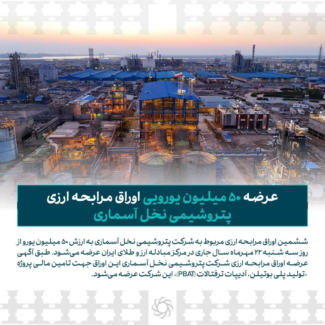 ششمین اوراق مرابحه ارزی به ارزش ۵۰ میلیون یورو برای پروژه پلیبوتیلن پتروشیمی نخل آسماری از ۲۲ مهر در مرکز مبادله ایران عرضه میشود.