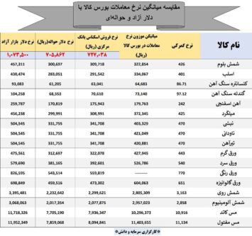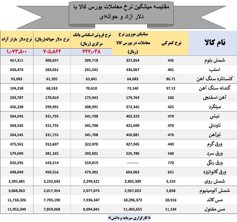 همسو با این روند معاملات فولادی ها در بورس کالا، نکته قابل توجه فاصله قیمتی میان متوسط نرخ شمش بلوم و سایر محصولها در بخش فولاد در بورس کالا و نرخ آنها در بازار آزاد است که گاها به بیش از ۱۰ تا ۱۵ هزار تومان به ازای هر کیلو میرسد. به نظر میرسد دلیل اصلی چنین شکافی را باید شکاف قیمت میان نرخ ارز مبادله ای و بازار آزاد دانست که مابهالتفاوت قیمتی ایجاد کرده است. مهار تورم و نزدیک شدن قیمت ارز مبادلهای و ارز بازار آزاد میتواند نوسان روبه جلوی قیمتها را کنترل کند. بررسی این روند را میتوان در جدول محاسبه قیمت که توسط کارگزاری دانش و سرمایه انجام شده مشاهده کرد.