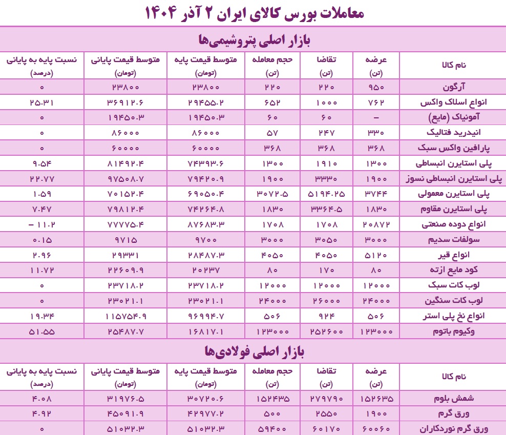 معاملات بورس کالای ایران ۲ آذر ۱۴۰۴ |