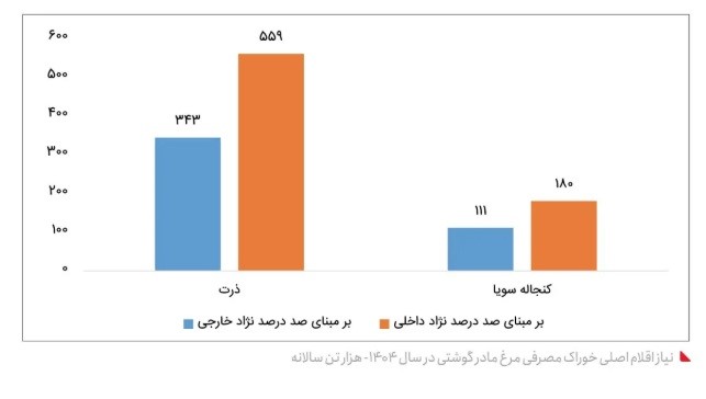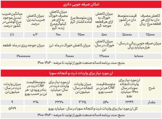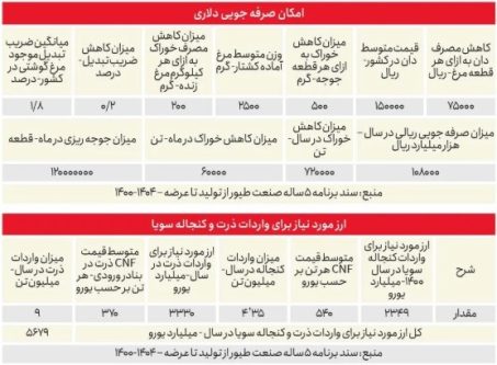 با توجه به نیاز ۴/۵ میلیون تنی کنجاله سویا در سال، نیاز به واردات چیزی بالغ بر ۴/۳۵ میلیون تن سویا در سال داریم. در صورتی که مصرف خوراک به ازای هر کیلوگرم مرغ زنده ۲۰۰ گرم کاهش پیدا کند، ۱۰ هزار و ۸۰۰ میلیارد تومان صرفهجویی میشود که با توجه به تخصیص ارز دولتی چیزی حدود ۵۰۰ میلیون دلار. این عدد بدون در نظر گرفتن آمار غیرواقعی تولید و میزان مصرف نهاده در این بخش محاسبه شده است.