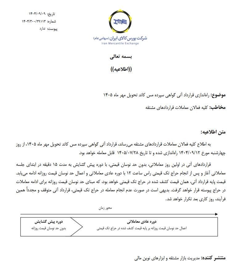 به گزارش اقتصادنگار، در این اطلاعیه اومده آست: این قراردادها تا ۲۸ مهر ۱۴۰۵ قابل معامله خواهد بود.