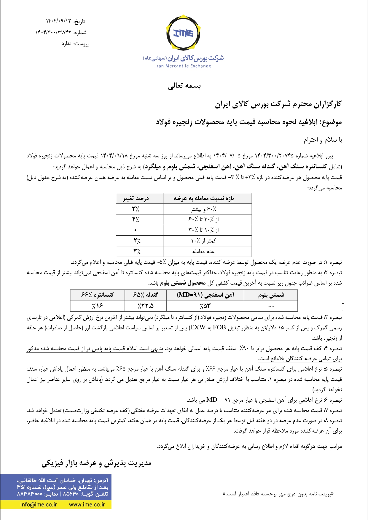بازه افزایش و کاهش قیمت پایه بسته به نسبت معامله به عرضه هر عرضهکننده همانند ابلاغیه های قبلی تا سقف ۳ درصد تعیین شده است.